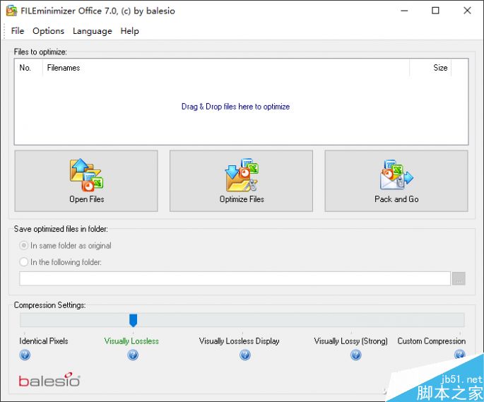 下載安裝FILEminimizer Office(下載地址:www.balesio.com,共享軟件,30天免費(fèi)試用),啟動(dòng)后,可以看出它的界面非常簡(jiǎn)潔。