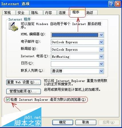 在“Internet 選項”中找到“程序”選項卡,將“檢查 Internet Explorer 是否為默認的瀏覽器”前面勾上,點擊確定退出。