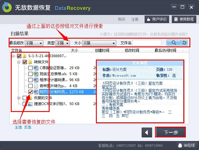 第四步:在掃描結果中,用戶可以通過瀏覽窗口瀏覽文件內容來判斷是否是需要恢復的文件,選擇需要恢復的文件,然后點擊下一步。
