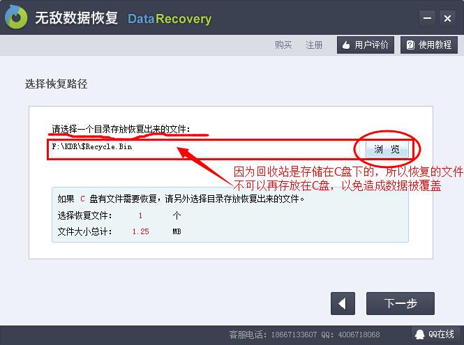 第五步:選擇恢復文件存儲路徑,這里文件不能存儲在C盤,以免造成數據恢復不完全。存放路徑設置好后點擊下一步。