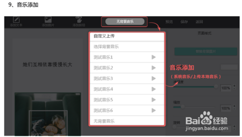 9、添加音樂,數據庫內置多個音樂素材可供添加,也可以自定義本地音樂,需注意的如果是>1M的音樂需壓縮至1M以內再上傳