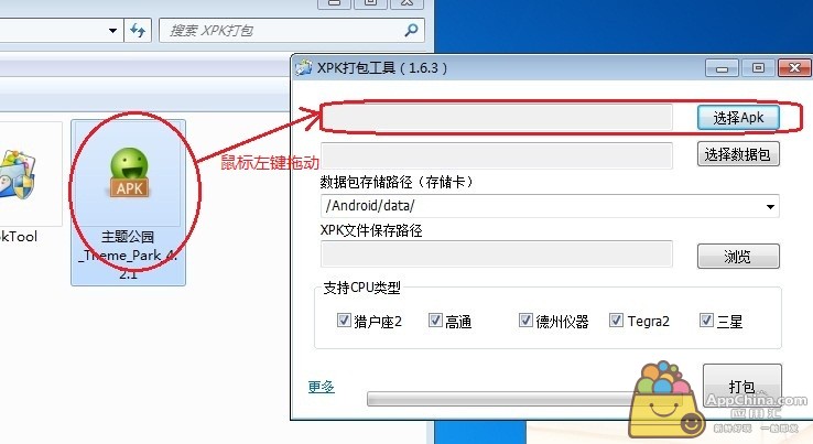 鼠標(biāo)左鍵選中已下載好的apk文件,拖動(dòng)到“選擇Apk"框內(nèi)
