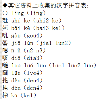 1、是在其它資料中另收集到的有音漢字。這部分漢語拼音僅供參考。