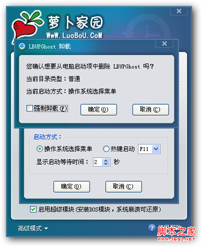 超級模塊允許用戶自定義系統備份文件夾的屬性,可以創建普通文件夾或者畸形文件夾(圖形界面下無法刪除),為了系統備份的安全還可以隱藏備份文件夾或者隱藏系統備份文件所在分區。可以設置密碼保護,防止別人誤操作,熱鍵啟動的功能類似品牌機的一鍵恢復,可以自定義開機熱鍵,電腦啟動時按下即可立即進入蘿卜家園一鍵還原界面。