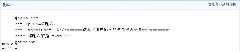 我們可以看到,這些代碼執(zhí)行有誤,原因是 > 在批處理中是作為定向符(特殊符號(hào))的,在這里不能作為普通字符傳給變量test,如果要將它作為普通字符傳給變量test,可以有兩中辦法:一是常見的轉(zhuǎn)義(就是在特殊字符前加個(gè) ^),二就是使用 引號(hào),如將代碼改為以下,即可: