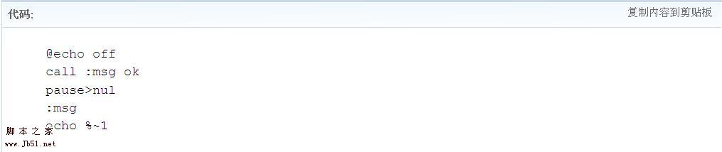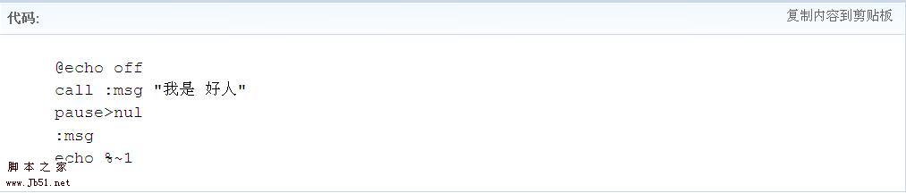 以上代碼的標(biāo)簽 :msg 的作用就是顯示傳給它的字符,如這里 call :msg ok,就是顯示ok(相當(dāng)于echo ok),如果要顯示“我是好人”,只需要 call :msg 我是好人 即可。