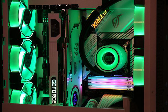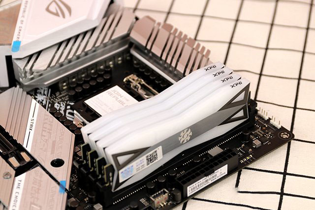 內(nèi)存方面,4條XPG龍耀D60G DDR4 3600 8GB*4,總?cè)萘窟_(dá)32GB,銀白色的散熱馬甲有著超過60%的發(fā)光面積,配合同步RGB光效使用效果很炫,而且支持XMP 2.0還可以一鍵超頻,相當(dāng)不錯。