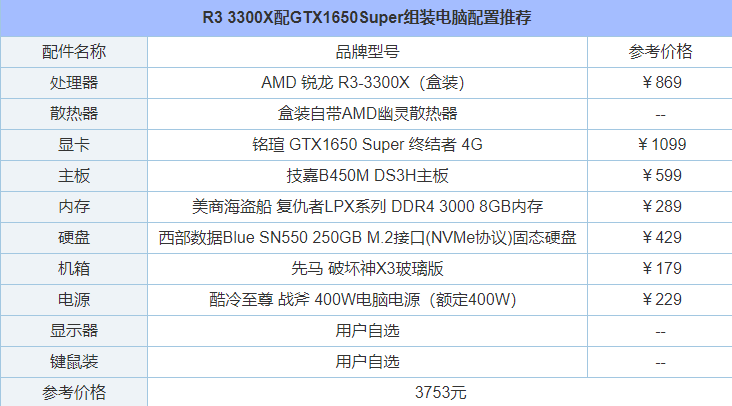 R3 3300X配GTX1650Super組裝電腦配置推薦