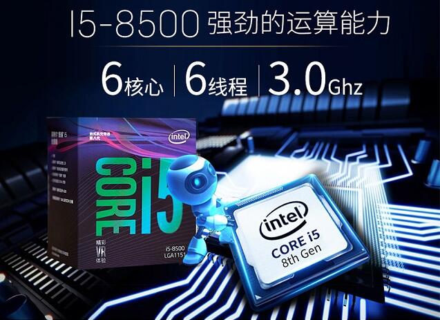 對于5000左右的預算的游戲主機來說,Intel平臺最佳搭配的處理器就是i5 8400了。14nm工藝,6核6線程,默認主頻2.8Ghz,加速頻率3.8Ghz,9M三級緩存,性能定位中端偏上,CPU具備暢玩各類大型3D游戲的能力。