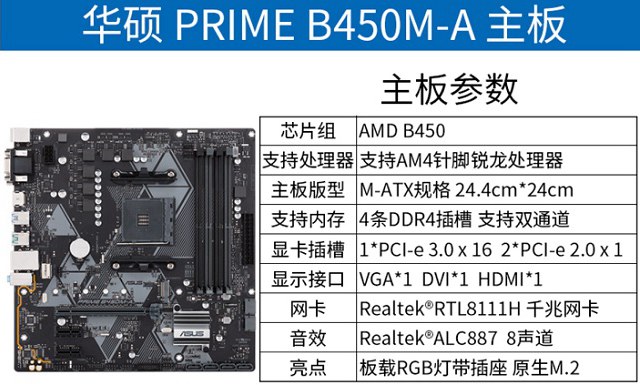 主板推薦的是華為PRIME B450M-A ,也是今年上市的主板,屬于B350主板的升級版,其與X470類似,全面開放了超頻支持。華為PRIME B450M-A主板基于M-ATX緊湊型設計,提供四根內存插槽,并配備原生M.2高速SSD擴展接口,板載RGB燈帶插座。