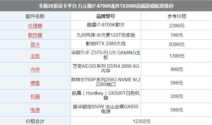 眾所周知,英偉達正式發布了全新的RTX 20系顯卡新品,一共為大家帶來了三款顯卡新品,分別是RTX2070、RTX2080和RTX2080Ti。其中國行最先上市的是RTX2080和2080Ti,其實GTX2080顯卡國內首發指導價為6499元,當然了不同的顯卡生產廠商是可以小幅度調整價格的。今天全網首發為大家帶來了萬元級i7-8700K配RTX2080高端游戲配置推薦,一起來看看全新20系顯卡平臺,感興趣的朋友千萬不要錯過了。