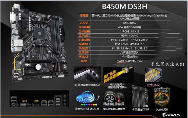 技嘉B450M-DS3H基于最新的B450芯片組,擁有7相扎實的數字供電設計,可完美支持銳龍AMD Ryzen一二代處理器。雖然是M-ATX小板型設計,但是它仍然保持了較好的擴展功能,包括四根DDR4內存插槽、一根PCIe 3.0 x16(x16)插槽、六個SATA 6.0 Gb/s接口,一個M.2插槽,I/O背板處還擁有四個USB3.0接口以及兩個USB3.1接口等等,實用性非常的不錯。