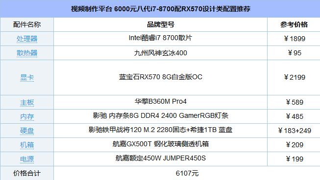 一起來看看小編為他定制的八代i7-8700配RX570設計類配置推薦,預算在6000元左右,適合搞設計和視頻制作,清單如下。