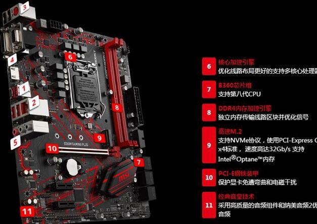 主板方面,小編推薦的是微星B360M GAMING PLUS主板,屬于一線大品牌,品質有保障。這款主板支持NVMe協議,使用PCI-Express Gen3 x4標準, 速度高達32Gb/s 支持Intel®Optane™內存、支持第八代CPU,獨立內存傳輸線路區塊并優化信號。核心加速引擎結合MSI優化線路布局和電源設計,讓您的電腦能更好的支持多核心處理器。