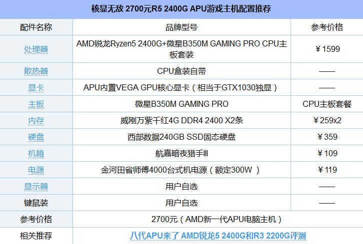 以下是AMD八代APU R5 2400G主機配置方案,如下所示。