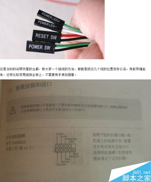 a.別的線其實都比較容易,對新手來說,可能比較復雜的,就是下面這幾根線了。這幾根其實就是連接機箱上的開關(guān)、重啟、電源燈的。分別是POWER LED+(電源燈正極)、POWER LED-(電源燈負極)、RESET SW(重啟鍵)、POWER SW(開關(guān)鍵),這個的插拔,一定記得按照說明書來插。