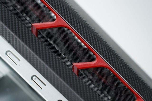 在細節上,雷神Force T8Ti游戲主機也有一些獨到的設計,比如在機箱前面板采用碳纖維材質,看起來很有質感;側面進風口位置采用紅色的格柵,并且還配有防塵網,能夠在一定程度上起到過濾灰塵的作用。