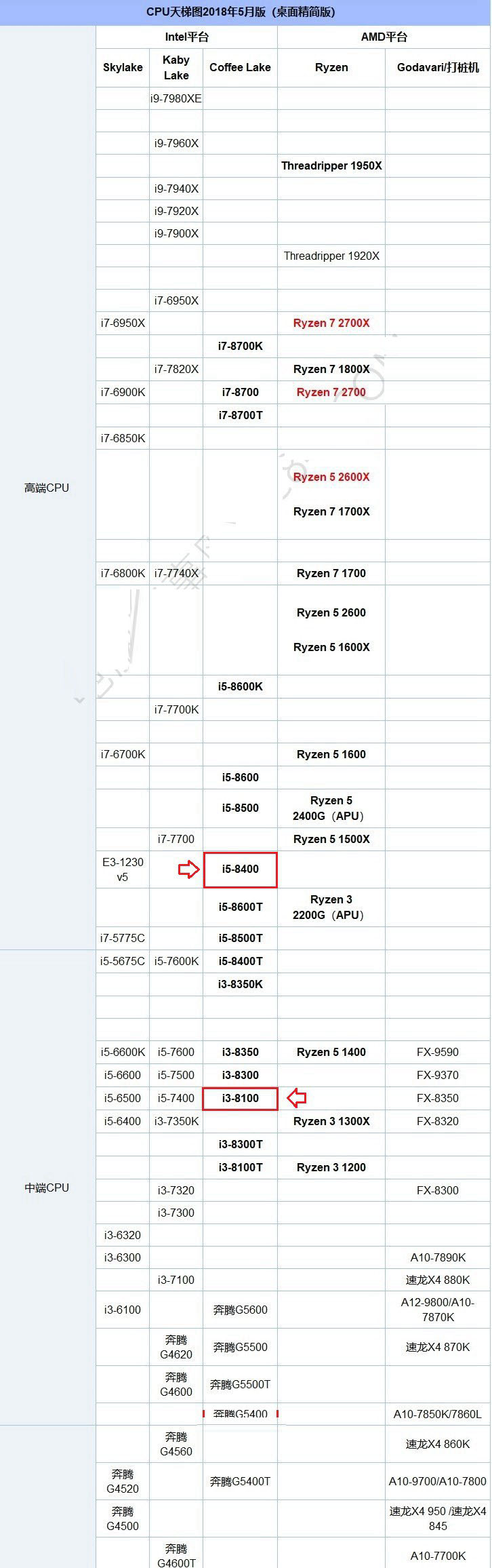 關(guān)于性能上的差距,最直觀的方法是參照CPU天梯圖,下面我們引用五月版CPU天梯圖,看看這兩款處理器的排名情況如何。