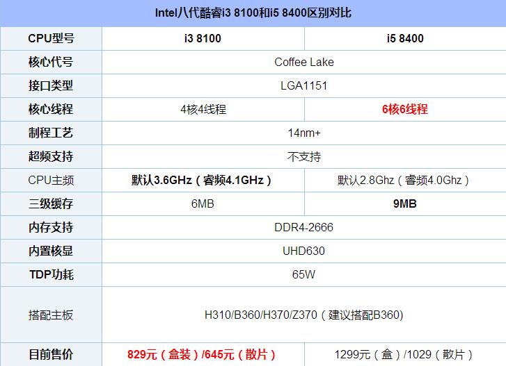 價格方面,下面以2018.5.17的報價為參考,i3 8100散片目前價格是645元,盒裝則為829元;i5 8400散片價格則為1029元,盒裝為1349元。