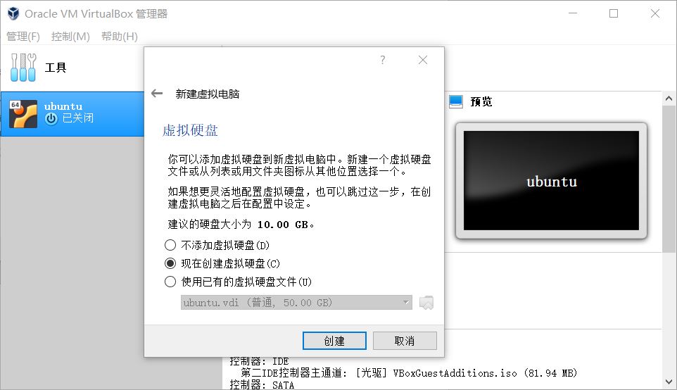 注意:這里根據(jù)自己的使用情況選擇虛擬硬盤的大小,一般20G足夠,博主這里選擇的是50G