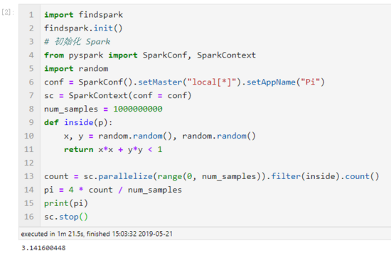 # 導入 findspark 并初始化import findsparkfindspark.init()from pyspark importSparkConf,SparkContextimport random# 配置 Sparkconf =SparkConf().setMaster("local[*]").setAppName("Pi")# 利用上下文啟動 Sparksc =SparkContext(conf=conf)num_samples =100000000definside(p): x, y = random.random(), random.random()return x*x + y*y <1count = sc.parallelize(range(0, num_samples)).filter(inside).count()pi =4* count / num_samplesprint(pi)sc.stop()運行示例: