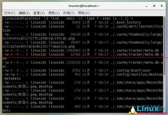 [linuxidc@localhost ~]$ find . -mmin -10 -type f -exec ls -l {} +輸出如下: