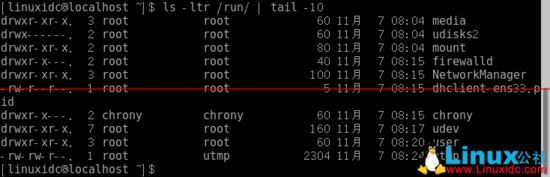 [linuxidc@localhost ~]$ ls -ltr /run/ | tail -10