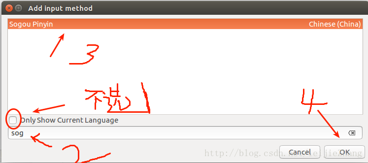首先,去掉那個只“顯示當前語言”的選項,然后搜索框輸入sog,你會發現搜狗輸入法已經有了,選中輸入法即可