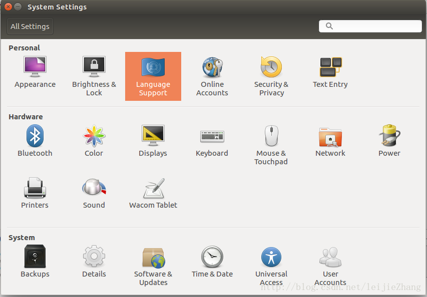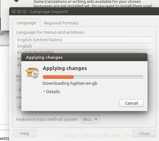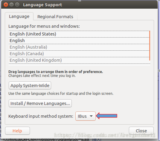 3.從系統設置里面點擊“語言支持”,一開始的系統里面是沒有小企鵝輸入法的,搜狗輸入法就是在小企鵝輸入法基礎上安裝的,從語言支持里面選擇小企鵝輸入法(fcitx),默認為ibus