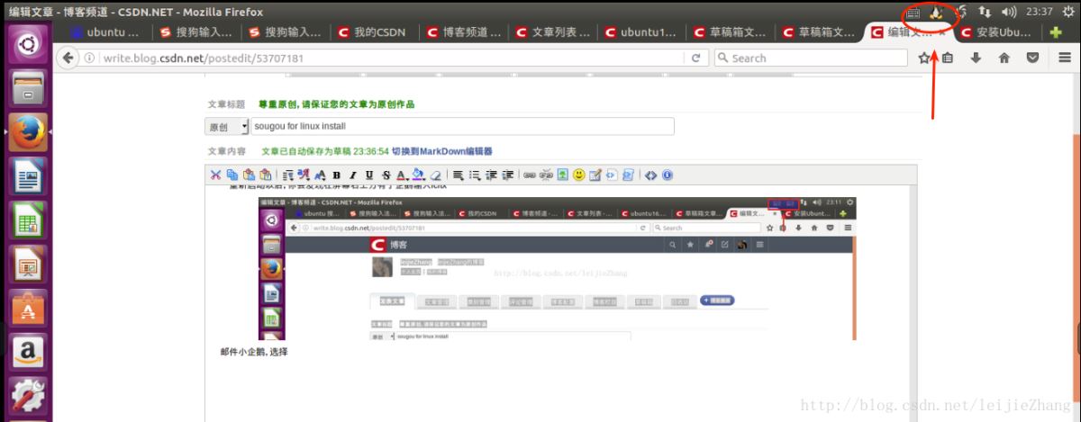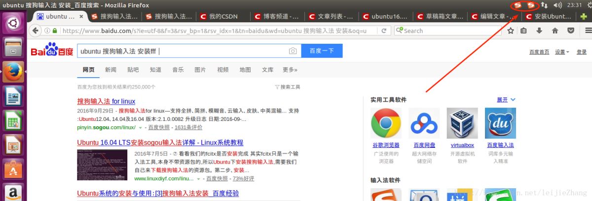 7.然后打開一個能輸入文字的軟件,比如瀏覽器,輸入文字的時候,恩shift見,你會發現輸入法有了,搜狗輸入法安裝成功,輸入文字正常,但是這個時候,輸入法顯示會亂碼,沒關系,重啟就好了