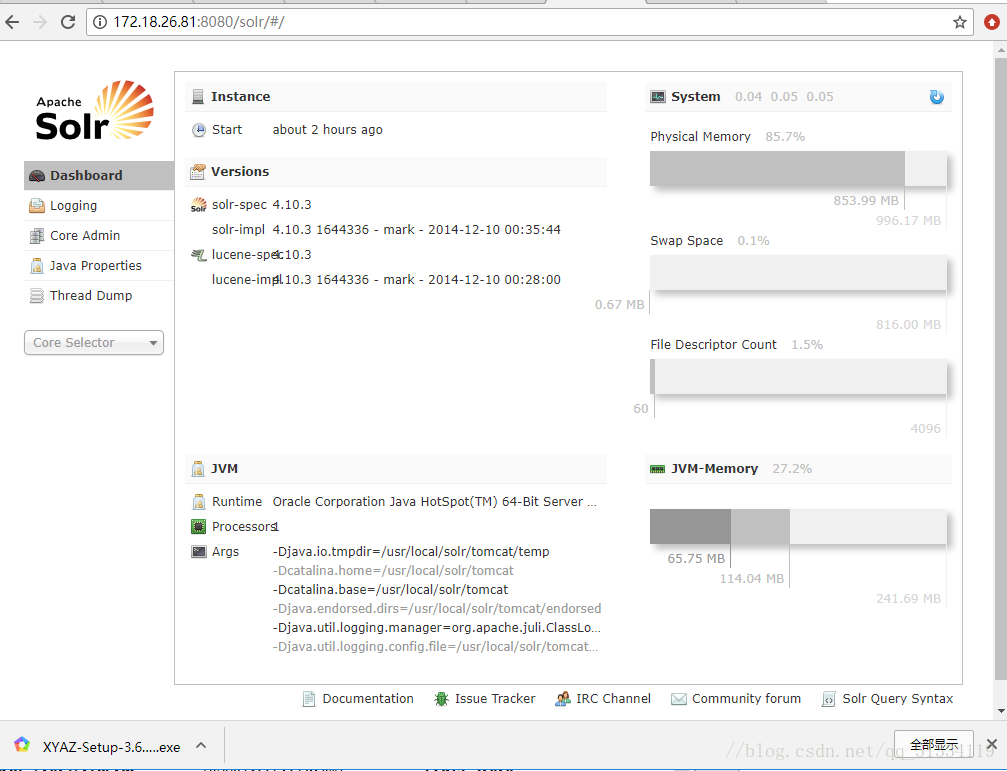 [root@localhost ~]# tail -f /usr/local/solr/tomcat/logs/catalina.out十二月 26, 2017 6:55:43 下午 org.apache.catalina.startup.HostConfig deployDirectory信息: Deploying web application directory /usr/local/solr/tomcat/webapps/manager十二月 26, 2017 6:55:43 下午 org.apache.catalina.startup.HostConfig deployDirectory信息: Deploying web application directory /usr/local/solr/tomcat/webapps/docs十二月 26, 2017 6:55:43 下午 org.apache.coyote.AbstractProtocol start信息: Starting ProtocolHandler ["http-bio-8080"]十二月 26, 2017 6:55:43 下午 org.apache.coyote.AbstractProtocol start信息: Starting ProtocolHandler ["ajp-bio-8009"]十二月 26, 2017 6:55:43 下午 org.apache.catalina.startup.Catalina start信息: Server startup in 12850 ms
