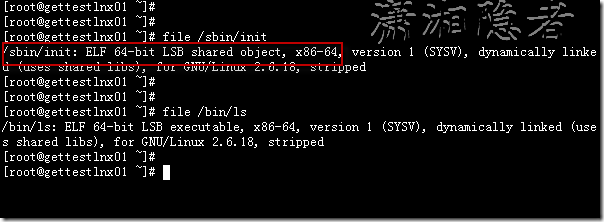 [root@gettestlnx01 ~]# file /sbin/init/sbin/init: ELF 64-bit LSB shared object, x86-64, version 1 (SYSV), dynamically linked (uses shared libs), for GNU/Linux 2.6.18, stripped[root@gettestlnx01 ~]#[root@gettestlnx01 ~]#[root@gettestlnx01 ~]# file /bin/ls/bin/ls: ELF 64-bit LSB executable, x86-64, version 1 (SYSV), dynamically linked (uses shared libs), for GNU/Linux 2.6.18, stripped