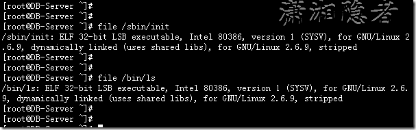 [root@DB-Server ~]# file /sbin/init/sbin/init: ELF 32-bit LSB executable, Intel 80386, version 1 (SYSV), for GNU/Linux 2.6.9, dynamically linked (uses shared libs), for GNU/Linux 2.6.9, stripped[root@DB-Server ~]#[root@DB-Server ~]#[root@DB-Server ~]# file /bin/ls/bin/ls: ELF 32-bit LSB executable, Intel 80386, version 1 (SYSV), for GNU/Linux 2.6.9, dynamically linked (uses shared libs), for GNU/Linux 2.6.9, stripped
