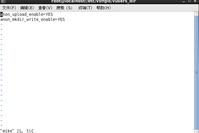 [root@localhost /]# mkdir /etc/vsftpd/vusers_dir[root@localhost /]# cd /etc/vsftpd/vusers_dir[root@localhost vusers_dir]# vi mike