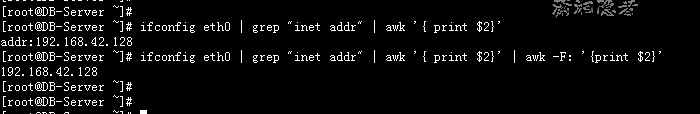 [root@DB-Server ~]# ifconfig eth0 | grep "inet addr" | awk '{ print $2}'addr:192.168.42.128[root@DB-Server ~]# ifconfig eth0 | grep "inet addr" | awk '{ print $2}' | awk -F: '{print $2}'192.168.42.128