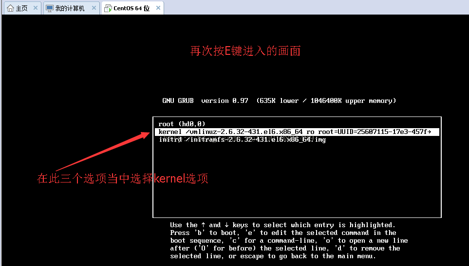 2,緊接著,咱們再次按下E鍵,進入編輯命令,在圖中的三個選項當中,咱們選中kernel 內核模式下進行編輯