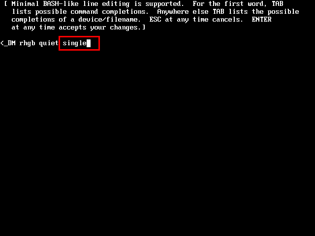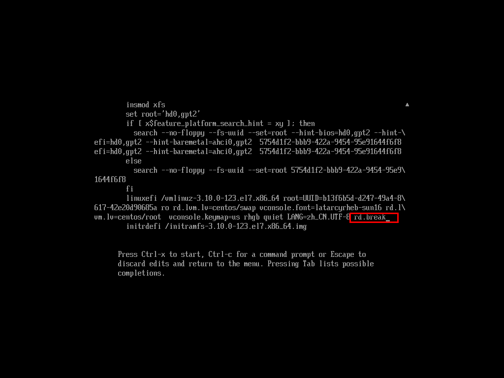 倒數(shù)第二行最后,輸入rw init=/bin/bash,快捷鍵Ctrl+x重啟。
