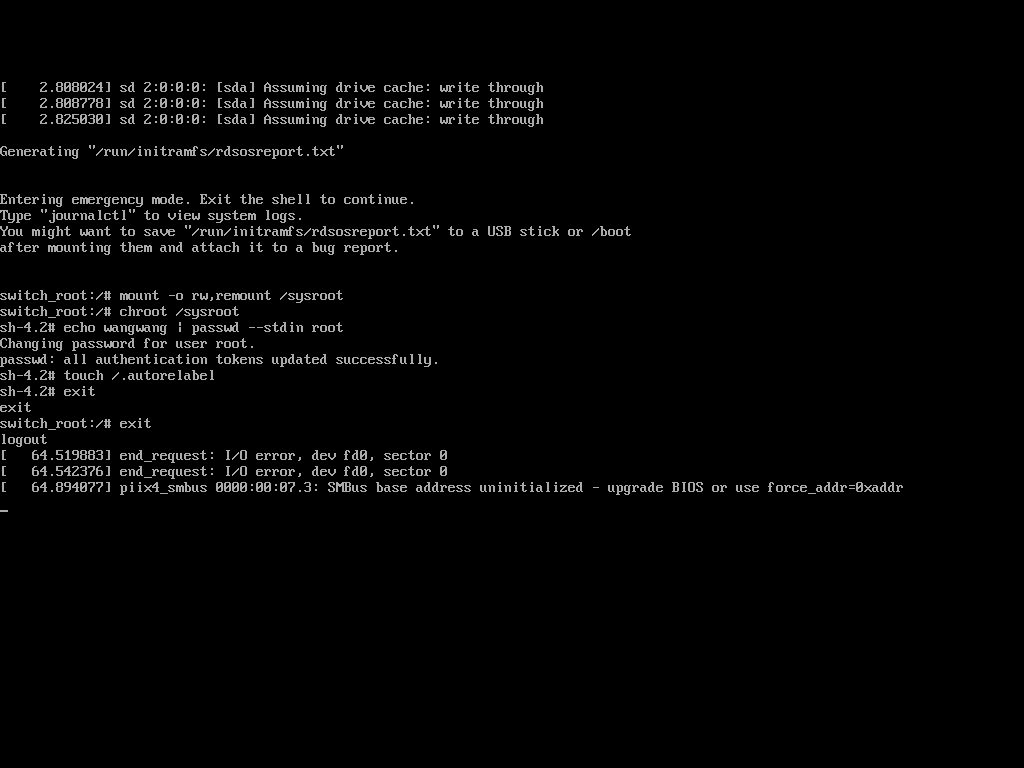 switch_root # mount -o rw,remount /sysroot/switch_root # chroot /sysroot/sh-4.2 # passwd rootsh-4.2 # touch /.autorelabelsh-4.2 # exitswitch_root # exit