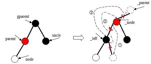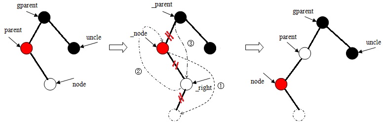 void rb_insert_color(struct rb_node *node, struct rb_root *root) { struct rb_node *parent, *gparent; while ((parent = rb_parent(node)) && rb_is_red(parent)) //雙親結(jié)點不為NULL,且顏色屬性為紅色 { gparent = rb_parent(parent); //獲得祖父結(jié)點 if (parent == gparent->rb_left) //雙親結(jié)點是祖父結(jié)點左子樹的根 { { register struct rb_node *uncle = gparent->rb_right; //獲得叔父結(jié)點 if (uncle && rb_is_red(uncle)) //叔父結(jié)點存在,且顏色屬性為紅色 { rb_set_black(uncle); //設(shè)置叔父結(jié)點為黑色 rb_set_black(parent); //設(shè)置雙親結(jié)點為黑色 rb_set_red(gparent); //設(shè)置祖父結(jié)點為紅色 node = gparent; //node指向祖父結(jié)點 continue; //繼續(xù)下一個while循環(huán) } } if (parent->rb_right == node) //當node是其雙親結(jié)點右子樹的根時 { register struct rb_node *tmp; __rb_rotate_left(parent, root); //左旋 tmp = parent; //調(diào)整parent和node指針的指向 parent = node; node = tmp; } rb_set_black(parent); //設(shè)置雙親結(jié)點為黑色 rb_set_red(gparent); //設(shè)置祖父結(jié)點為紅色 __rb_rotate_right(gparent, root); //右旋 } else { // !(parent == gparent->rb_left) { register struct rb_node *uncle = gparent->rb_left; if (uncle && rb_is_red(uncle)) { rb_set_black(uncle); rb_set_black(parent); rb_set_red(gparent); node = gparent; continue; } } if (parent->rb_left == node) { register struct rb_node *tmp; __rb_rotate_right(parent, root); tmp = parent; parent = node; node = tmp; } rb_set_black(parent); rb_set_red(gparent); __rb_rotate_left(gparent, root); } //end if (parent == gparent->rb_left) } //end while ((parent = rb_parent(node)) && rb_is_red(parent)) rb_set_black(root->rb_node); } 四、刪除