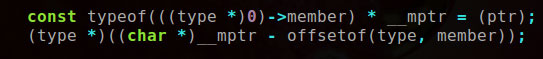 第二步,用(char *)__mptr減去member在結(jié)構(gòu)體中的偏移量,得到的值就是整個(gè)結(jié)構(gòu)體變量的首地址(整個(gè)宏的返回值就是這個(gè)首地址)。