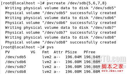 1.首先將硬盤sdb分4個區每個區大小200M,分別是sdb{5,6,7,8}。后將四個分區建立pv