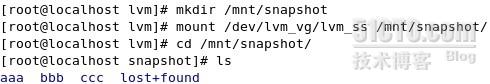 命令如下lvcreate -l 12 -s -n lvm_ss lvm_ss /dev/lvm_vg/lvm_lv 快照建立完成后我們將其掛載到/mnt/snapshot下