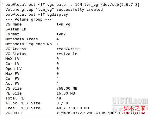建立命令如下vgcreate -s 16M lvm_vg /dev/sdb{5,6,7,8}。