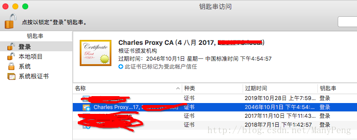 點擊Install Charles Root Certificate之后,會彈出mac的鑰匙串訪問頁面