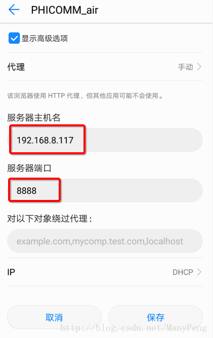點擊代理后進入如下界面,服務器主機名處填寫剛才查到的電腦的ip地址即可,服務器端口填寫第一步中charles處設置的端口,默認是8888,如果做了修改,填寫設置charles時修改的端口值。