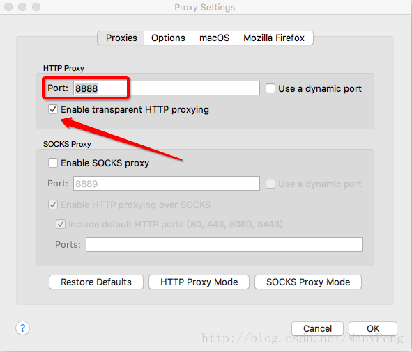 記住此處的port,默認為8888,也可以進行修改,只要不沖突就可以,勾選上Enable transparent HTTP proxying,到此為止完成charles上的初步設置。