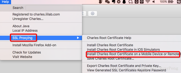 接著需要在手機端安裝證書,點擊Charles上的Help->SSL Proxying->Install Charles Root Certificate on a Mobile Device or Remote Browser