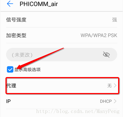手機上進入wifi設置,一般按住你正在連接的wifi一會會彈出一個菜單,點擊修改網絡就到如下界面,勾選“顯示高級選項”,點擊代理