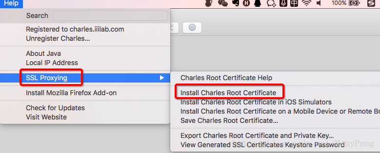 首先是MAC的配置,進入charles的Help->SSL Proxying->Install Charles Root Certificate