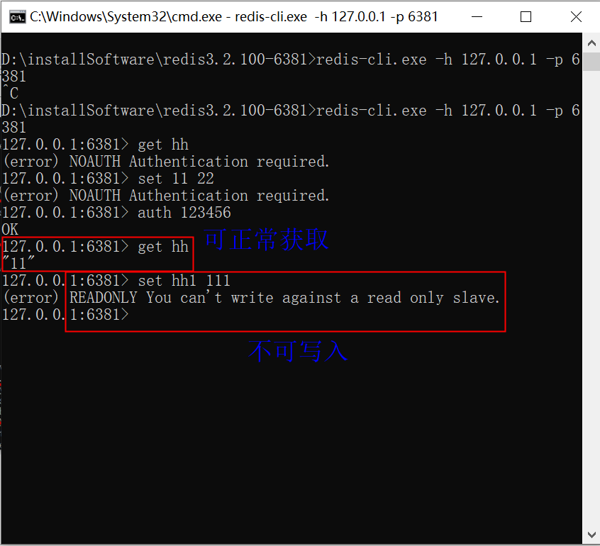 ②,客戶端,在客戶端可獲取主客戶端添加的數據,但是無法寫入數據(如果master設置密碼,slave需認證密碼:author密碼)